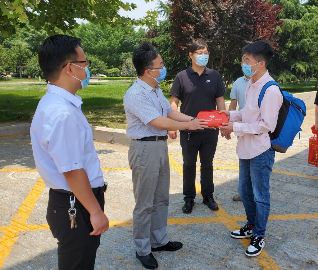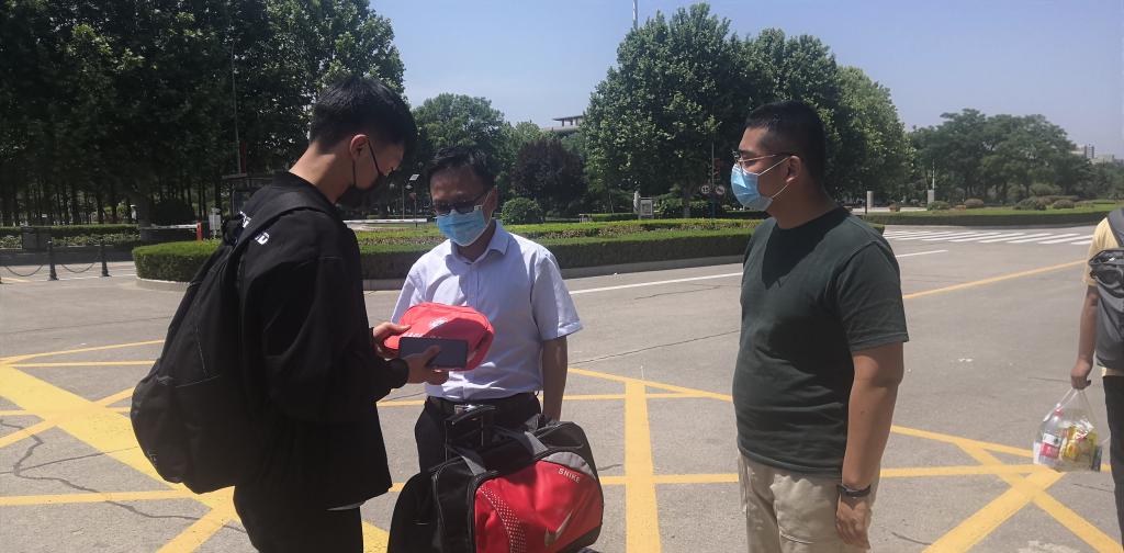 系党总支书记卫建勋、副书记辛允东和辅导员老师到校门口,热情迎接返校学生,与学生亲切交谈,详细了解他们疫情防控期间居家学习生活情况,并叮嘱他们要强化疫情防控意识,安心完成各项学习任务,要求同学们严格服从学校疫情防控期间管理,坚决做到“十四个不”,有任何异常第一时间上报辅导员和系领导。并向返校学生赠送含有口罩、体温计、消毒湿巾、餐券和疫情期间校园实用手册、防护手册等在内的“防疫健康礼包”。