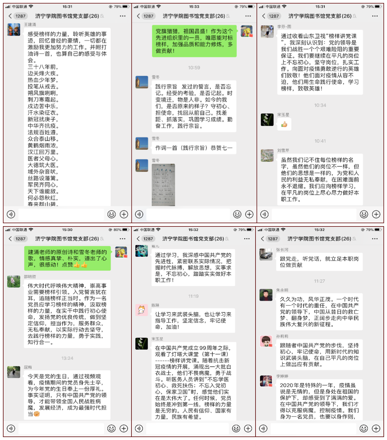 全体党员通过不同形式认真进行了观看,并围绕“榜样的力量”这一主题进行了讨论。大家在支部群里踊跃发言,谈收获、谈体会、谈打算,并撰写了观后感,有的党员还即兴创作诗篇,有的党员谱曲作词,创作歌曲,以此表达心声,学习榜样事迹,感受榜样力量,守初心、践使命,立足岗位,做好本职工作,为学校改革发展贡献力量。