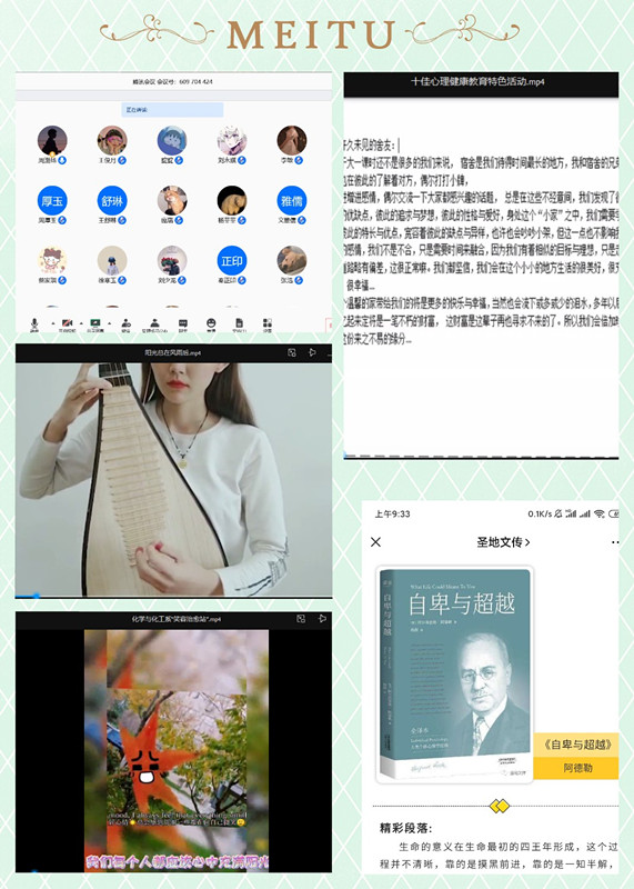 心理防疫作品征集活动:同学们把自身或别人经历的心理困惑和心理调节、疏导的过程以及心理调节小技巧,以文章、微课、小游戏、情景表演和图画等方式表现出来,见证心理的成长,发现成长的动力。
