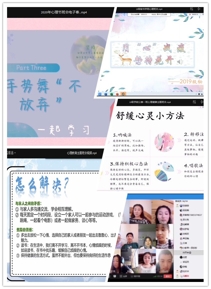心理健康教育主题班会大赛:围绕“珍爱生命”、“共同抗疫”、“呵护心灵”三个关键词,各系(院)以班级为单位开展。各班级根据专业特点,通过心理小游戏、视频播放、手势舞、主题分享和主题宣讲等方式进行,互动性强,不拘泥于传统班会。