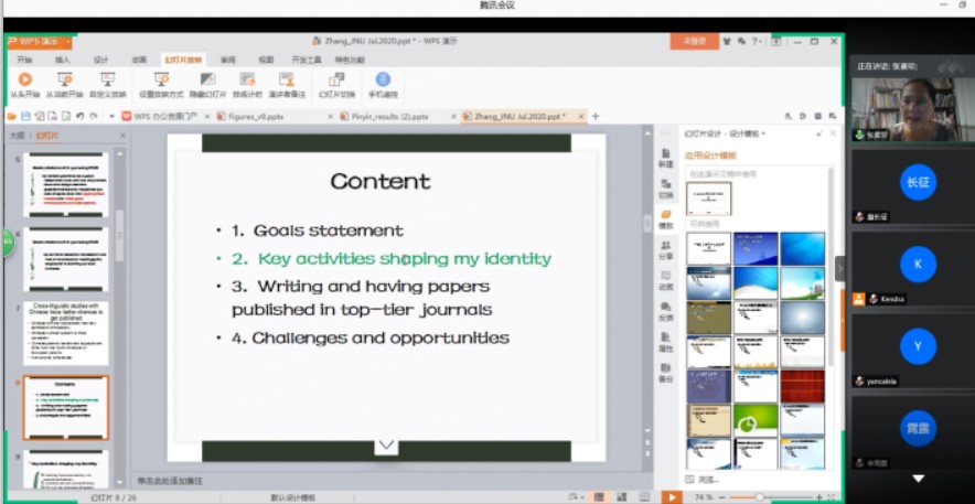 7月17日晚19:30-21:30,外国语系邀请大学外语教学部副教授张素珍老师作了题为《国际期刊论文撰写》的学术报告,报告以腾讯视频会议形式举办。外国语系主任杨楠教授、教师教育学院副院长曹光海、部分系部的教师代表和外国语系全体教师参加了此次报告会。报告会由外国语系副主任张颖主持。