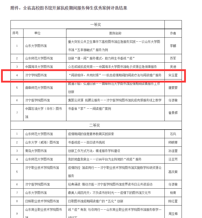 近日,“全省高校图书馆抗疫期间服务师生优秀案例征集”评选结果公布,我校图书馆提交的案例“阅读相伴,共克时艰---抗击疫情期间的阅读疗法与阅读推广服务”荣获一等奖。