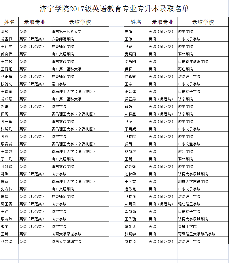 我校英语教育专业共有79名同学参加了2020年专升本考试,58名同学分别被青岛理工大学、山东第一医科大学、山东交通学院、亚星在线登录官网、枣庄学院、滨州学院、齐鲁师范学院、山东青年政治学院等本科院校录取,录取率达到了73%。