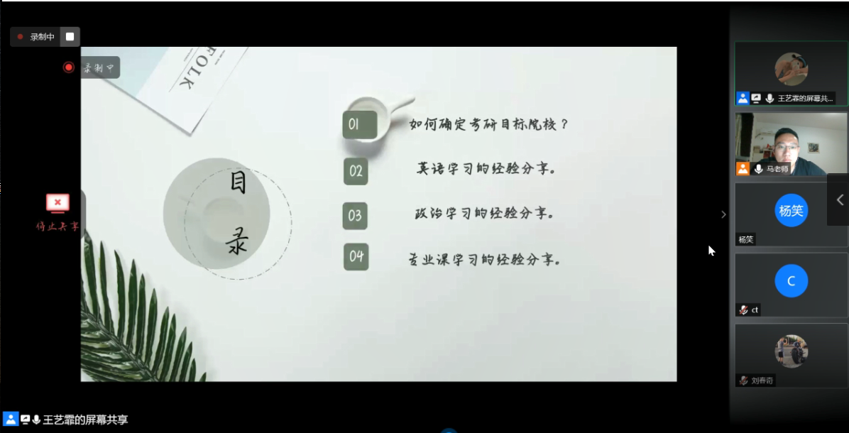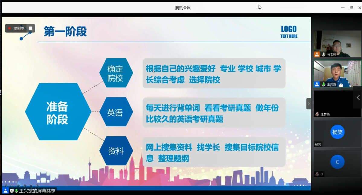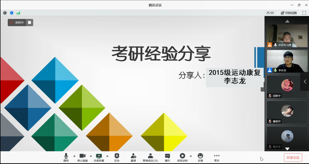 8月10月-12日上午,体育系成功举办线上考研经验交流会。考取研究生学生代表王兴宽、王艺霏、李志龙作了交流分享,2017级各专业全体学生参加活动。会议由系辅导员马腾主持。
