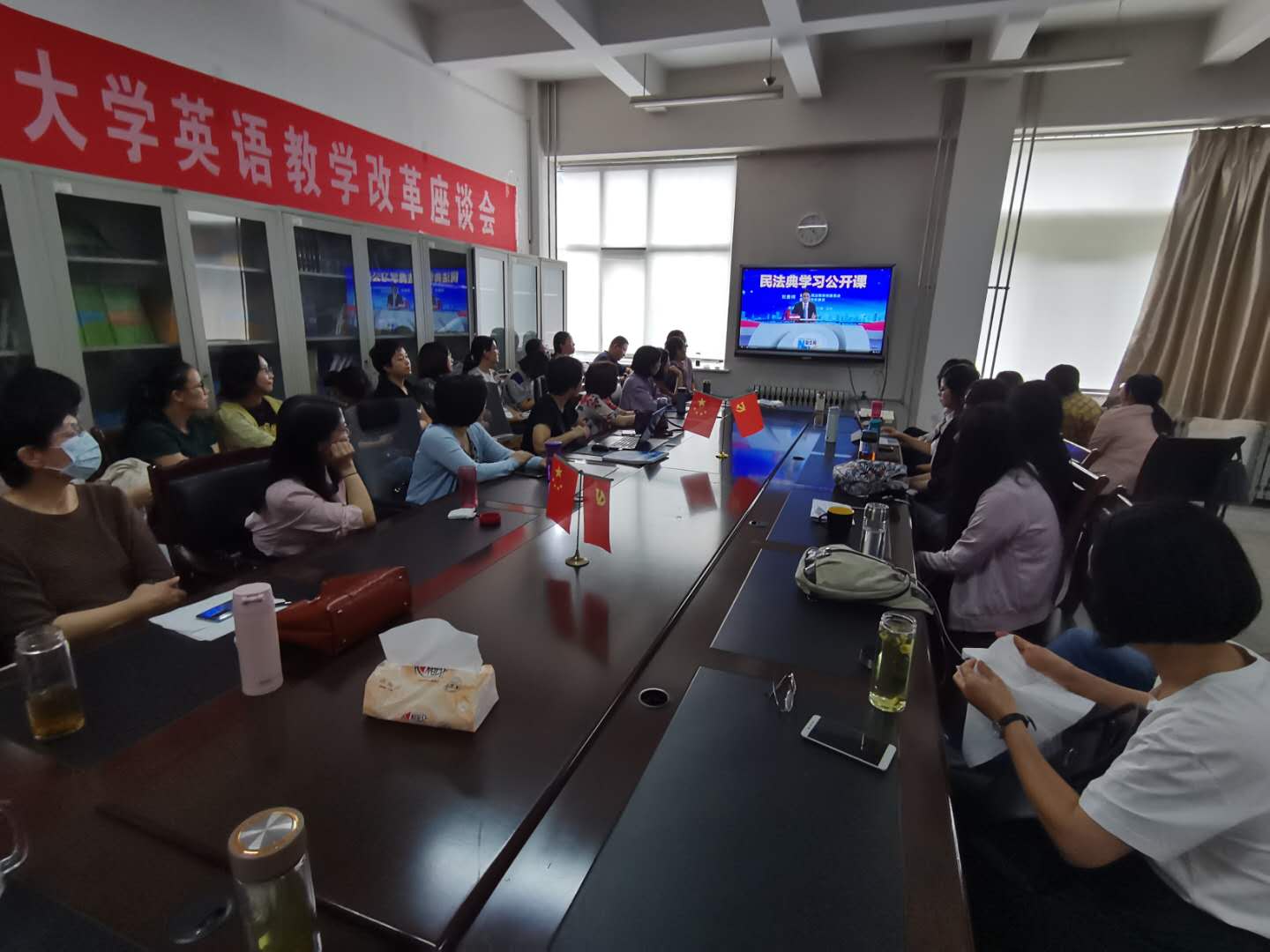 为深入学习贯彻习近平总书记在主持中央政治局第二十次集体学习时的重要讲话精神,加强民法典学习宣传,9月18日上午,大学外语教学部组织全体教师观看《民法典》公开课。