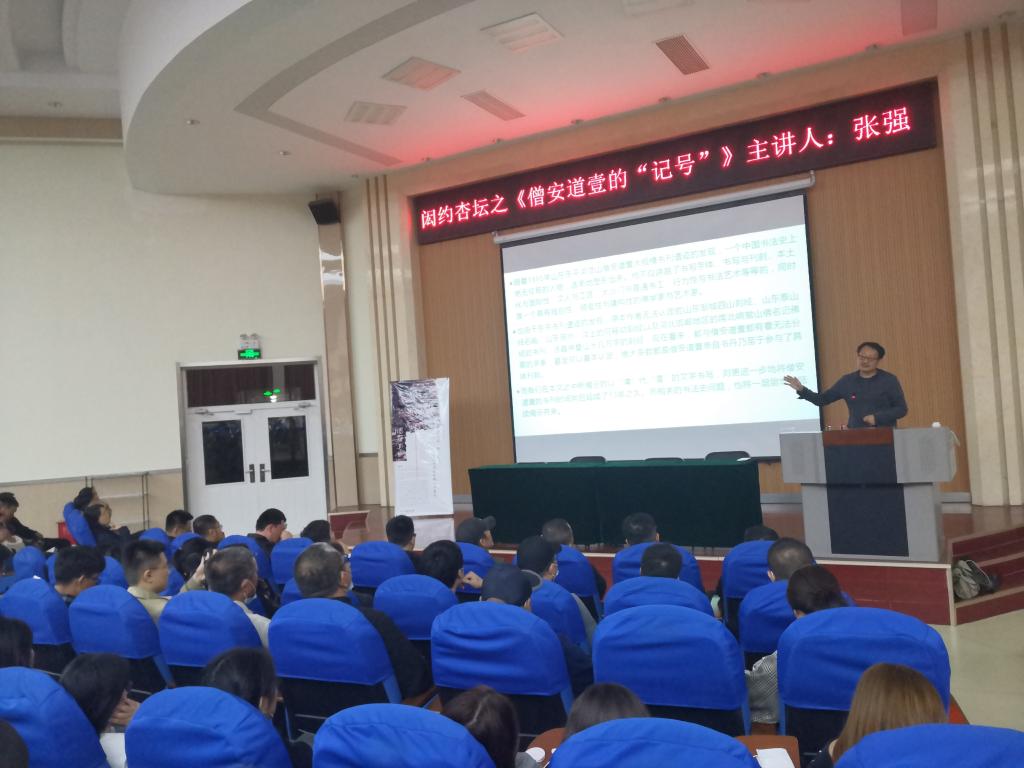 为提高师生书法美学修养,10月4日,美术系邀请两江学者、四川美术学院教授(二级)张强、天津美术学院教师、书法学博士肖庆祥,来校进行“闳约杏坛•大家讲堂”书法艺术专题讲座交流活动。山东省石刻艺术博物馆副馆长、中国汉画学会副会长杨爱国,中国社会科学院副研究员张翀出席,美术系师生及社会各界多位书法艺术学者、书法爱好者500余人参加,美术系副主任张继华主持。