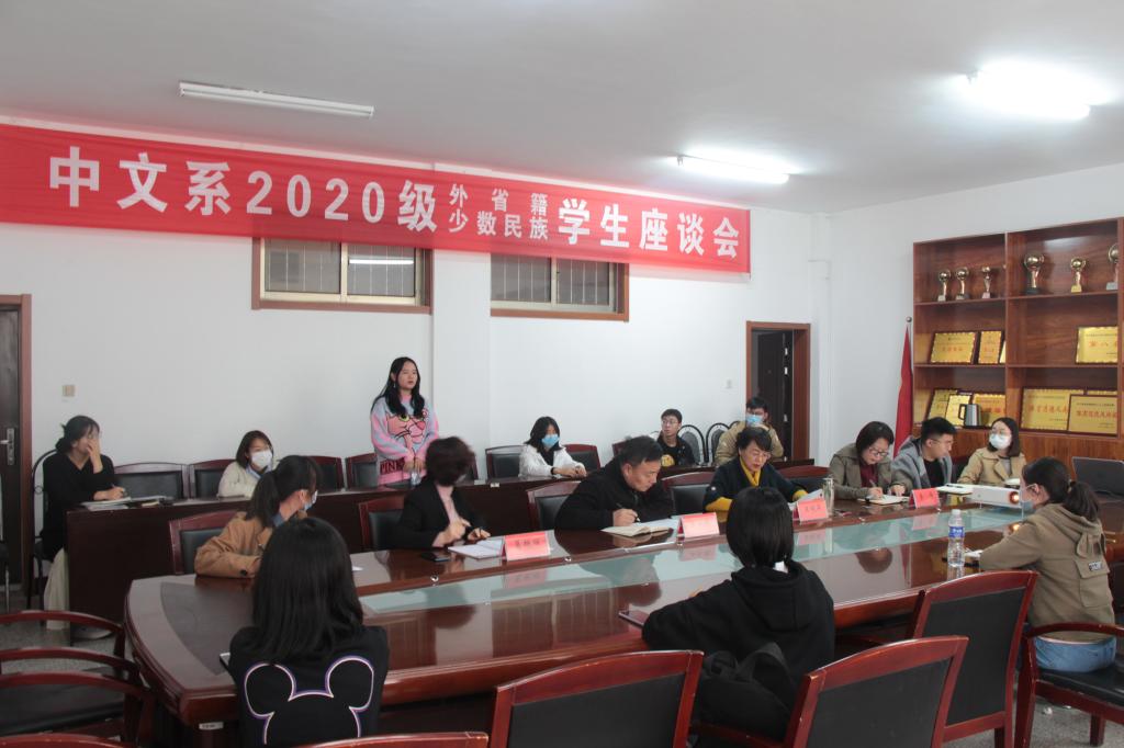 10月21日下午,中文系在系会议室召开2020级外省籍、少数民族学生座谈会。中文系党总支书记王艳萍、系主任王永超、党总支副书记李青、副主任葛艳丽、各年级辅导员及20多位来自多个省、自治区、直辖市的2020级外省籍、少数民族学生代表参加了本次座谈会。会议由党总支副书记李青主持。