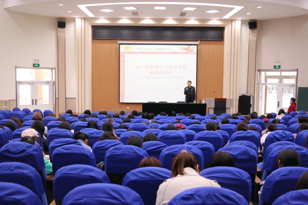 苏明校长从三个方面展开讲座,第一部分介绍了亚星在线登录官网第二附属小学的百年历程及发展探索,阐释了“办一所体现孔子教育思想的现代学校”这一办学理念确立的缘由及价值;第二部分介绍了孔子教育思想融入学校教育的六大途径,指出要将孔子教育思想融入学校文化、课程改革、班级管理、学生生活、教师发展并充分利用好社会、家乡资源,打造“传统文化进校园十大行动”;第三部分展示了亚星在线登录官网第二附属小学独具特色的“少年君子”传统文化教育活动,让学生直观感受了二附小浓厚的儒雅之风。