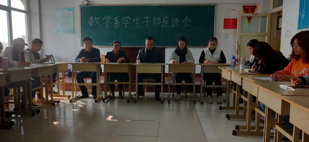 为进一步加强学生干部思想政治建设,提高学生干部的责任和担当意识,11月6日下午,数学系在理科楼C501召开了学生干部座谈会。系党总支书记来维龙、辅导员以及2018级班委参加了座谈会。座谈会由系党总支副书记韩西莲主持。