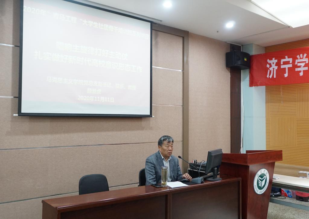 11月11日晚,“青马工程”暨2020年大学生社团骨干培训班系列讲座在图书馆一楼会议室开讲。我校马克思主义学院院长颜景虎应校团委邀请,为培训班学员作了题为《唱响主旋律打好主动仗 扎实做好高校意识形态工作》的讲座。校团委相关负责人参加并主持讲座。