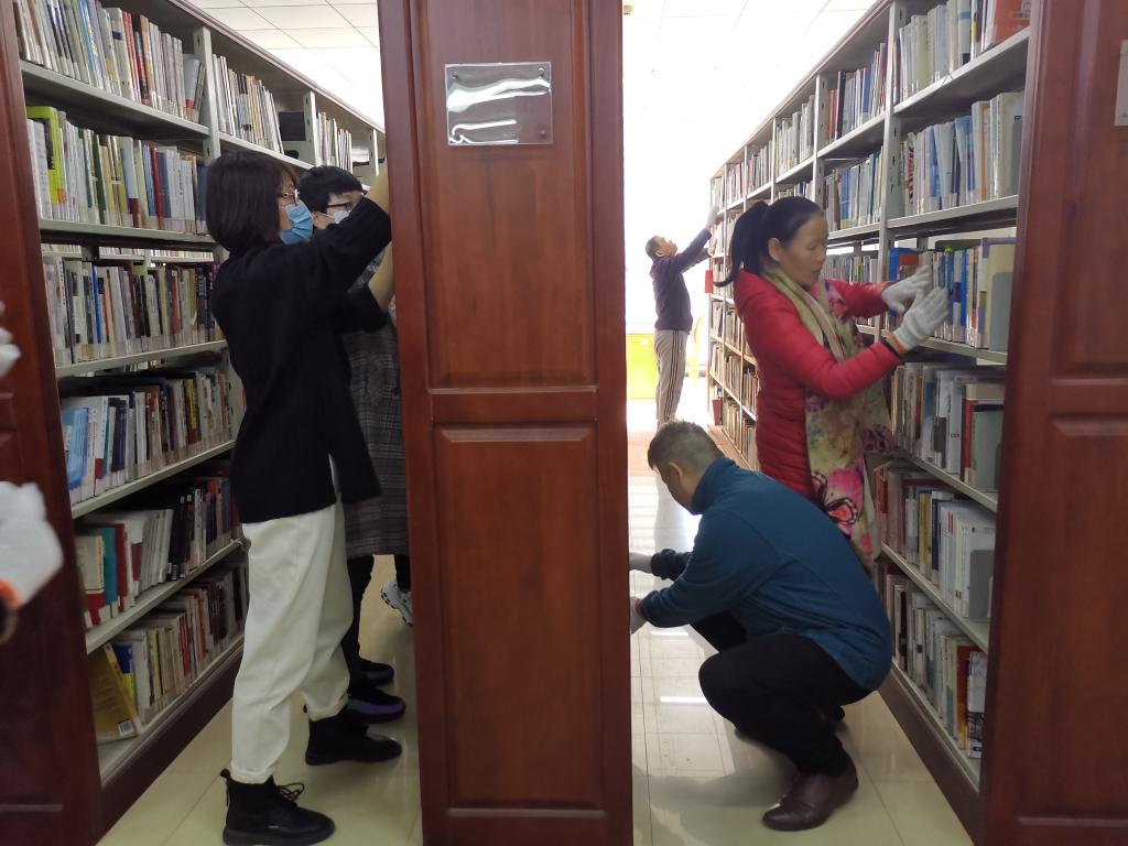 为彻底解决书架拥挤、乱架、预留架位不够等问题,党员老师们利用中午休息时间,齐聚在社会科学图书借阅室,集中进行倒架、整架、顺架工作。大家以党小组为单位,有的擦拭书架上的灰尖,有的负责快速挑出乱架的图书,有的专门进行搬运倒架。大家时而蹲下,时而踩凳站起,时而接力传送,时而讨论分类编目是否准确。党员老师们互教互学,互帮互助,不怕脏,不怕累,完美配合,能量爆棚。短短一个中午的时间,一排排架,一本本书,变得干净整齐,面貌一新。