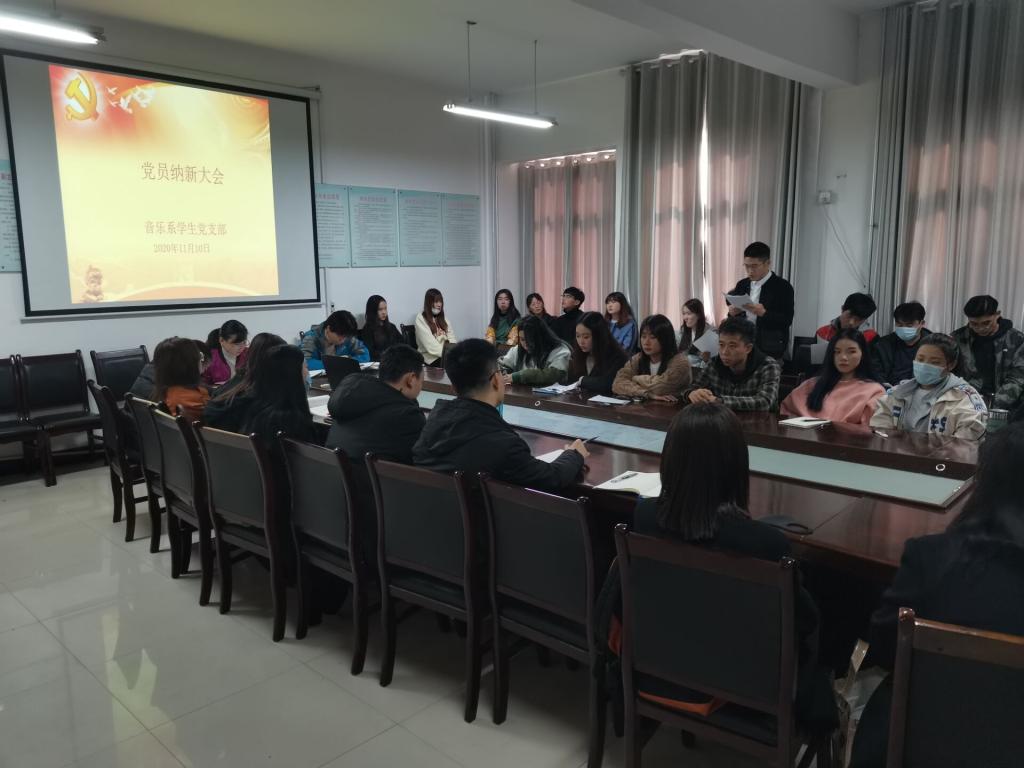 11月10日,音乐系学生党支部在音乐系二楼会议室召开了党员纳新大会,讨论发展对象袁彤彤等16名同志入党问题,会议由学生党支部书记岳娜主持,系党总支书记唐秋晶及支部全体党员参加了会议。
