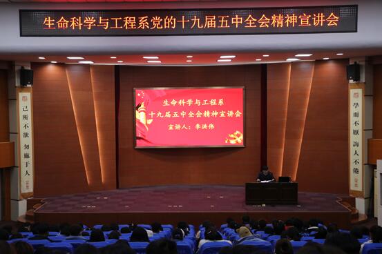 11月26日晚,生命科学与工程系举办党的十九届五中全会精神宣讲会。系党总支书记李洪伟作宣讲报告。师生代表300余人参加宣讲会。