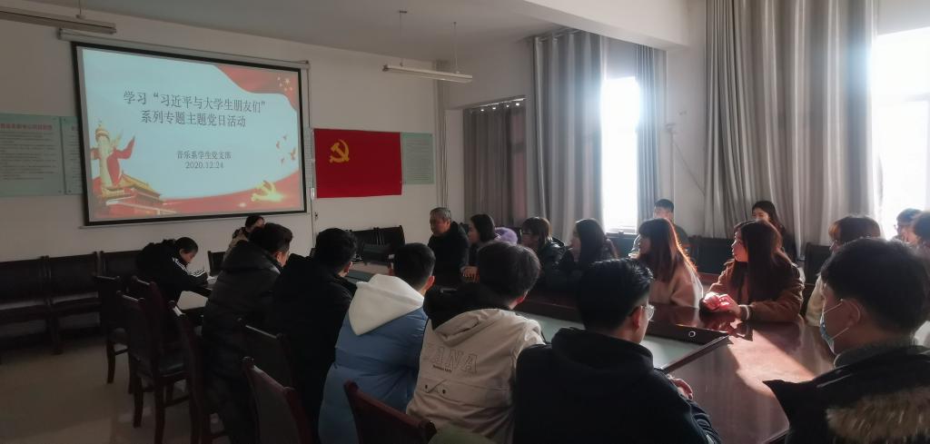 12月24日上午,音乐系学生党支部围绕《习近平与大学生朋友们》系列专题开展了主题党日活动。活动由支部书记主持,支部党员集体参加了学习与交流。