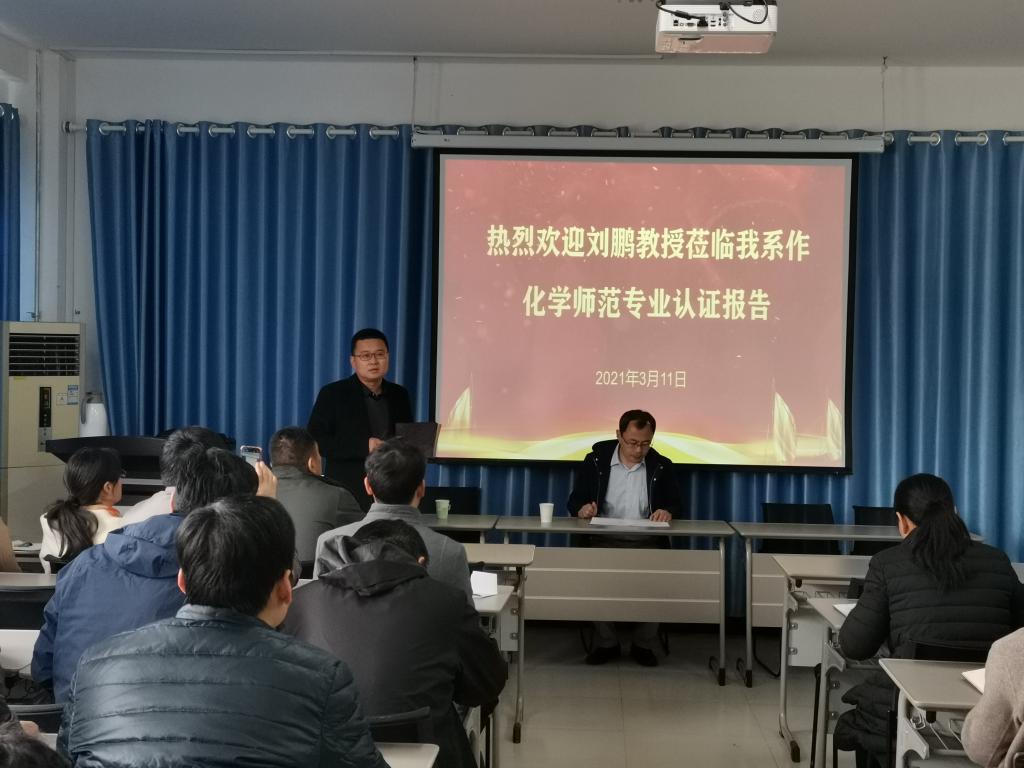 为扎实推进我系化学师范专业认证,进一步做好认证的组织和准备工作,3月11日下午,化学与化工系召开化学师范专业认证报告会。结合认证需要,我系邀请曲阜师范大学认证接待组成员刘鹏教授做了关于师范专业认证工作报告。化学与化工系全体教职工参加了会议。会议由系主任刘国栋主持。