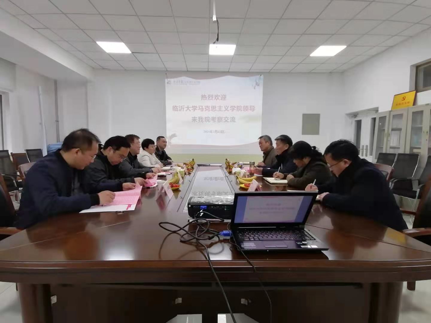 3月12日下午,临沂大学马克思主义学院党委书记徐东升、院长赵长芬、副书记颜春晓、副院长杨志刚和团委书记吴付法等一行6人来马院进行考察交流。马院院长颜景虎、党总支书记樊海涛、副院长张秀芳、办公室负责人颜培建和辅导员姚海生参加座谈交流。
