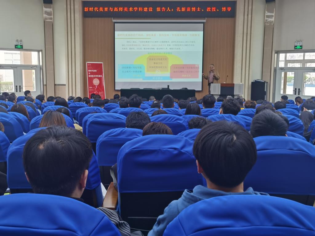 为进一步深入立德树人,加速现代化美育体系的构建与发展,3月23日,美术系特邀教育部艺术教育委员会常务委员、中国美术家协会美术教育委员会副主任、首届全国高校美育教学指导委员会委员孔新苗教授做客美术系闳约杏坛·大师讲堂,在3号楼报告厅作《新时代美育与高师美术学科建设》专题讲座。400余位师生聆听交流,系副主任司继琳主持。