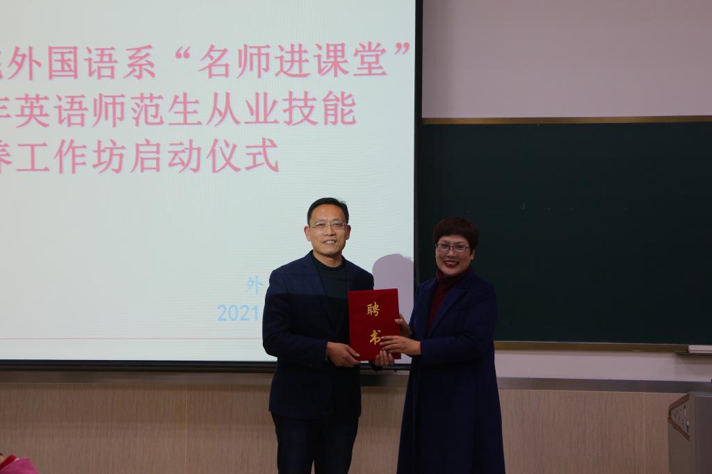 工作坊开始,杨楠主任为陈儒亭老师颁发聘书,感谢陈儒亭老师心系母校、感念师恩、用自己的知识和专长回馈母校,共话教育情怀,共享师者快乐;杨主任也表达了对在校英语师范生的殷切期望,希望同学们明确师范专业的职业要求,不断提升自身的教师技能水平,成长为一名能够担当起时代重任的人民教师。