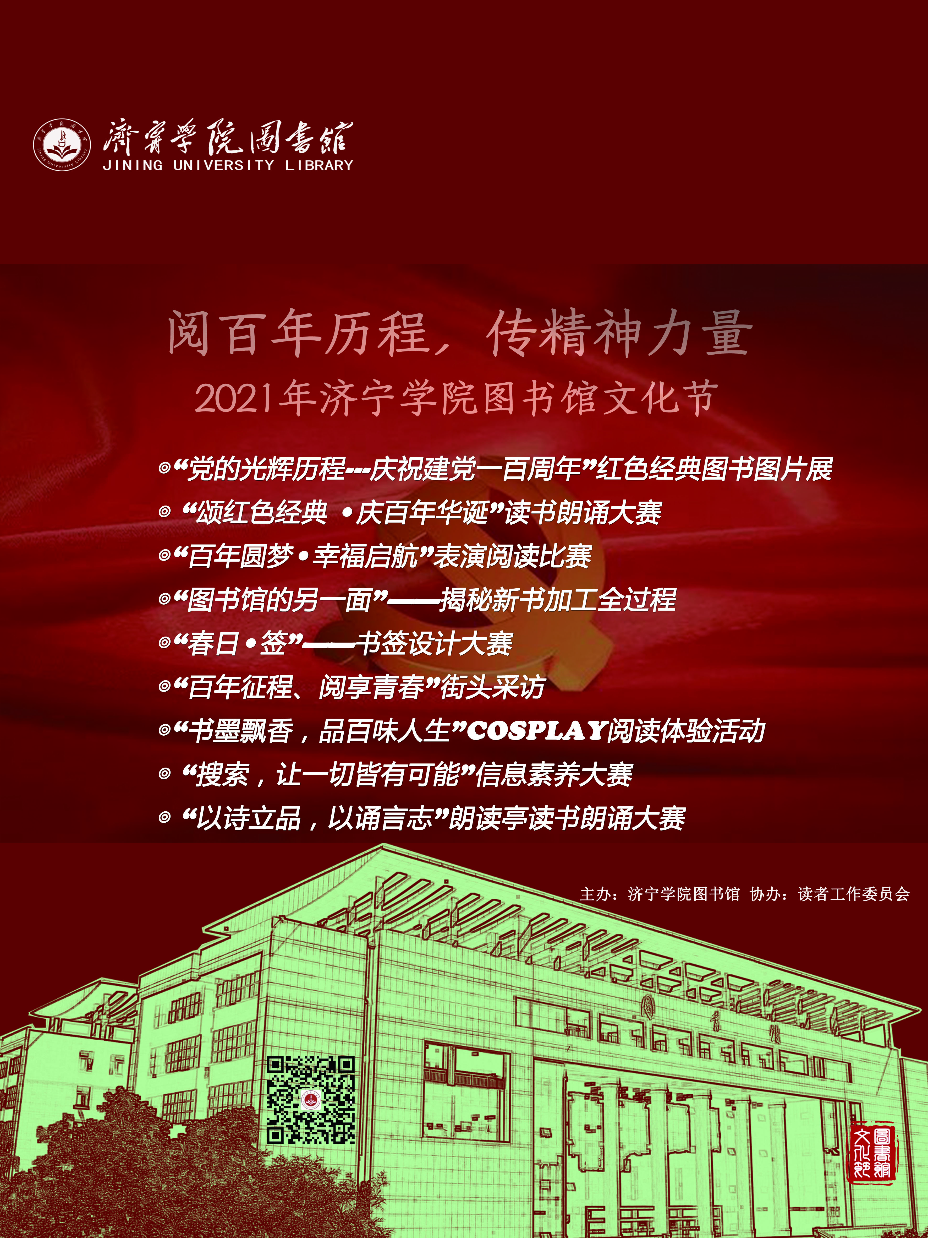 第26个世界读书日,恰逢建党一百周年。为引导广大师生回顾党的光辉历程,讴歌党的丰功伟绩,我校图书馆继续举办第八届“图书馆文化节”,本届文化节以“阅百年历程,传精神力量”为主题,自3月23日至5月23日,为期2个月,陆续推出“党的光辉历程——庆祝建党一百周年”红色经典主题书展、“颂红色经典•庆百年华诞”读书朗诵大赛、“百年圆梦•幸福启航”表演阅读比赛、“图书馆的另一面”——带你领略新书加工全过程、“春日•签”——书签设计大赛、“阅享青春”街头快闪采访、“书墨飘香,品百味人生”COSPLAY阅读体验活动、“搜索,让一切皆有可能”信息素养大赛、“以诗立品,以诵言志”朗读亭读书朗诵大赛等九项活动,期冀通过丰富多彩的阅读文化活动,让更多的读者走进图书馆,爱上阅读,养成全民阅读的良好风尚。