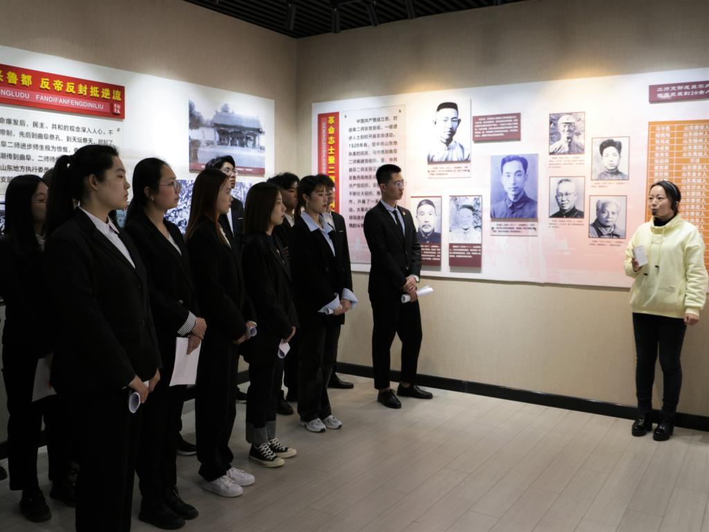 师生来到曲阜师范校区,就被校区的典雅古朴所吸引。在讲解员马道远老师的带领下,大家一同领略百年老校的风采。曲阜师范校区至今已有116年的历史,醒目的万里题词碑、古朴小礼堂、别致的工字楼、历史悠久的考棚、隔墙相望的阙里牌坊,厚重的历史,散发着沁人心脾的韵味。在“红二师”纪念馆学员们仔细观看了史料照片和文字资料,回顾了“中共省立二师党支部”95年的光辉革命历程,重温了“红二师”革命事迹,“1926年夏,中共曲阜二师支部诞生,这是鲁西南地区成立最早的共产党组织。党领导进步师生进行革命斗争,发生了许多震惊全国的重大事件,涌现出万里等一大批革命家。”听着老师的讲解,大家沉浸在那一段令人心潮澎湃的红色校史中。