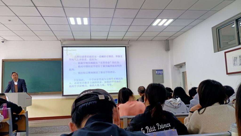 报告中,周文玖教授从中国史学现代化转型的视角,深刻分析了梁启超、胡适、郭沫若的史学贡献及特色,并从学术定位、个人才性、学术交往等方面对三位史学大师进行了全面比较。他指出:梁启超、胡适、郭沫若是中国史学由传统向现代转型的三个标志性的人物,具有“但开风气不为师”的学术地位。三人虽然学术气质各异,但都属于“球形的发展”式的天才学者(通才),同时他们在学术创造及交往方面有着密切的联系和相互影响。同时,周教授从实证的角度,批评了学术界否定郭沫若的不良倾向,指出郭沫若史学地位的不可否定性。报告结束后,他就历史学专业学习、考研、中国史学史研究等问题,现场回答了学生的提问。