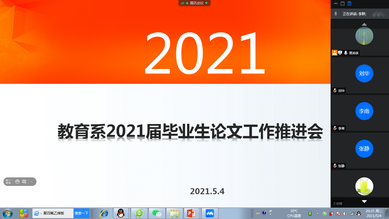 为保障本科生毕业论文质量,有序推进论文工作进展,5月4日晚,教育系使用腾讯会议在线上召开了2021届本科生毕业论文工作推进会,教育系主任李群、各专业论文负责人及全体论文指导老师参会,会议由副主任贾英侠主持。