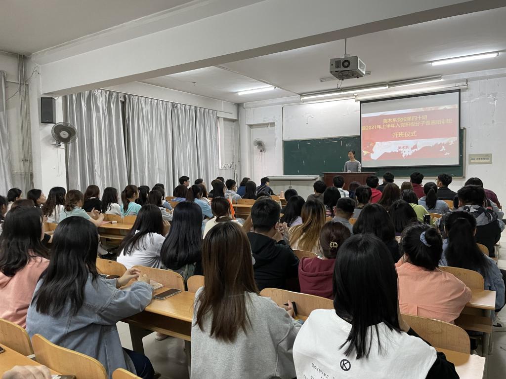 5月7日晚六点,美术系学生党支部于6#B305召开党校第四十期暨2021年上半年入党积极分子培训班开班仪式。美术系党总支书记杨晓青出席开班仪式并讲话,仪式由系党总支副书记、学生党支部书记孔翠主持。