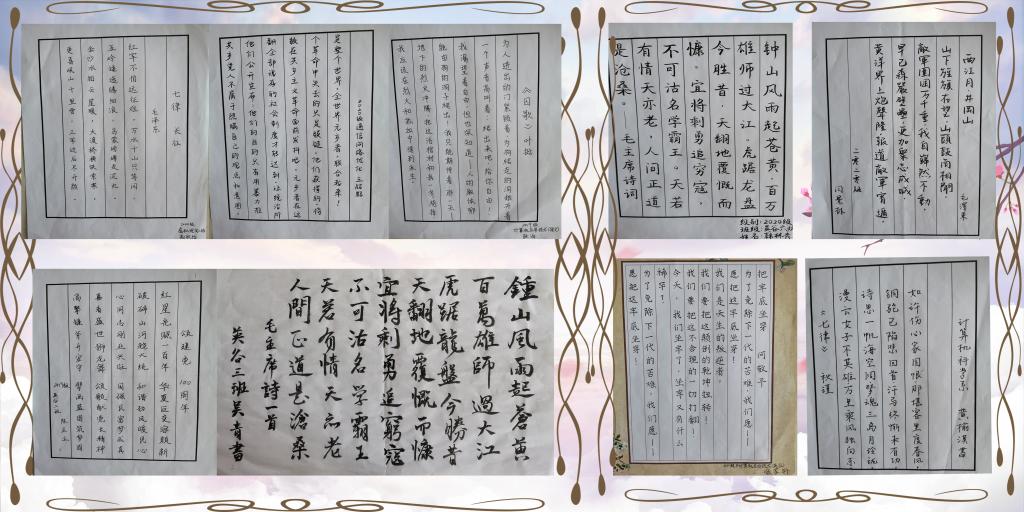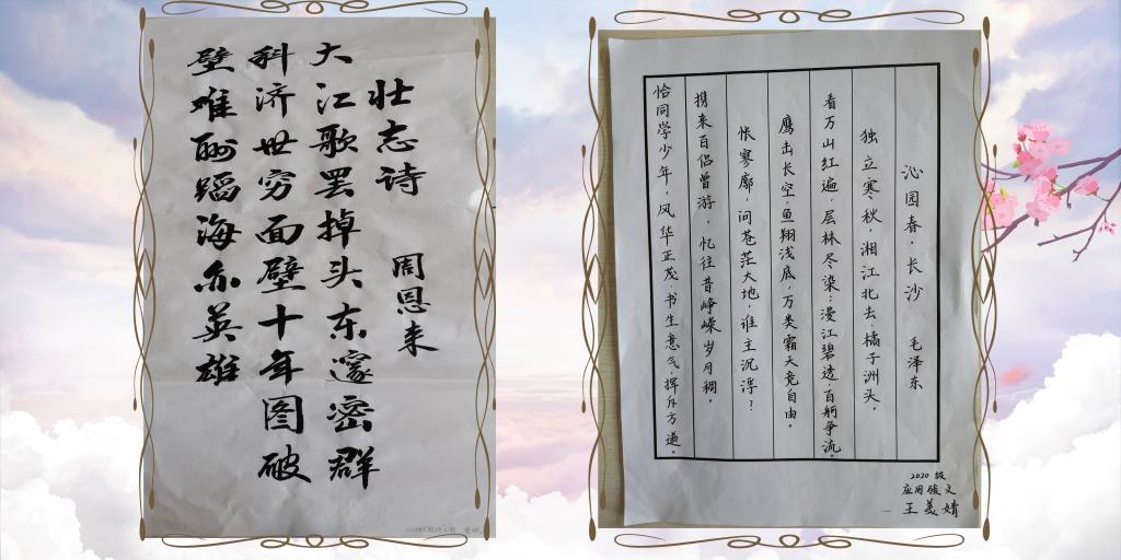 本次诗文书法大赛活动分为硬笔书法和软笔书法两种形式,共征集作品近百份。经过层层选拔,最终17份优秀作品脱颖而出,获得表彰。众多优秀作品从不同角度展现了党在人民心中的地位和分量。成长路上,党的光辉照耀着我们前进,党的形象深刻在我们心里,一等奖是2020级应用骏文专业王美婧的作品《沁园春·长沙》,其苍劲有力的笔法抒写出进步青年对国家命运的感慨和以天下为己任,蔑视反动统治者,改造旧中国的豪情壮志;2019级软件工程专业曹斌的作品《壮志诗》雄健洒脱,让同学们更深切地感悟到周恩来总理的伟大人格,激励我们不忘初心、继续前进。此外,其它优秀作品也透过不同的视角表现了对党的忠诚和热爱,或感人至深,或振奋精神。