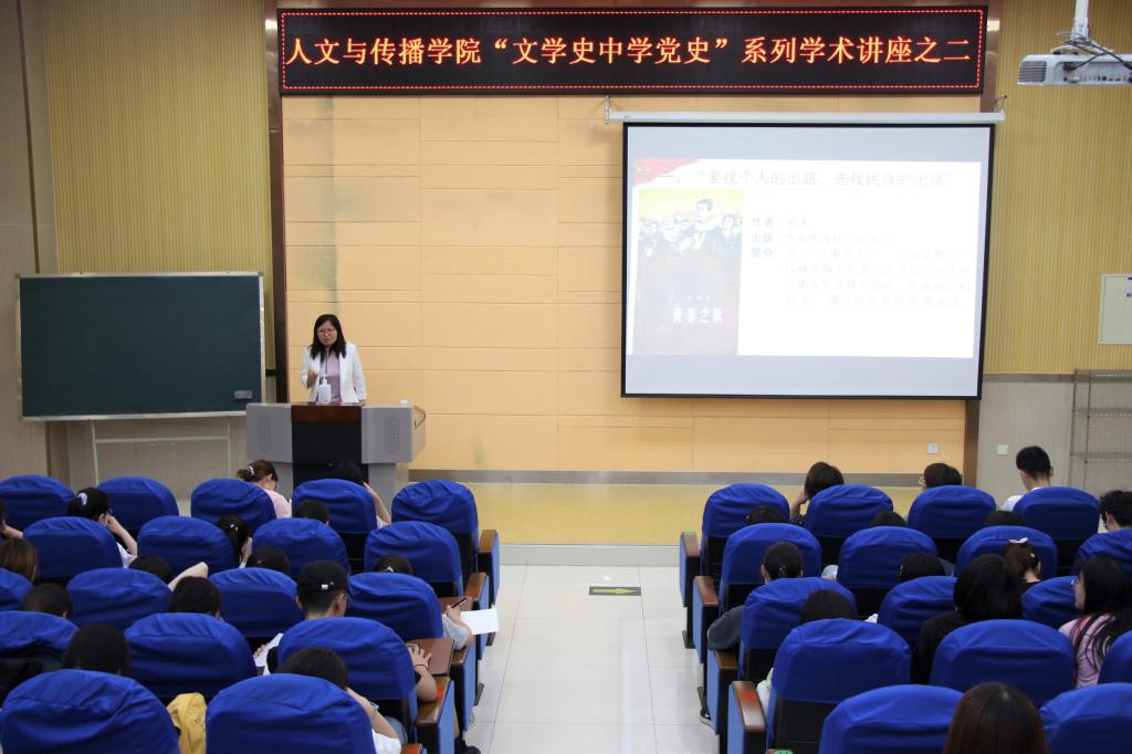 5月24日晚,人文与传播学院“文学史中学党史”系列学术讲座第二场在文科楼B101室顺利举行。该院教授、文学博士赵双花应邀作题为《要找个人的出路,先找民族的出路—来自文学的青春成长启示》的讲座。该院党委副书记李青担任讲座主持人,200余名师生到场聆听。