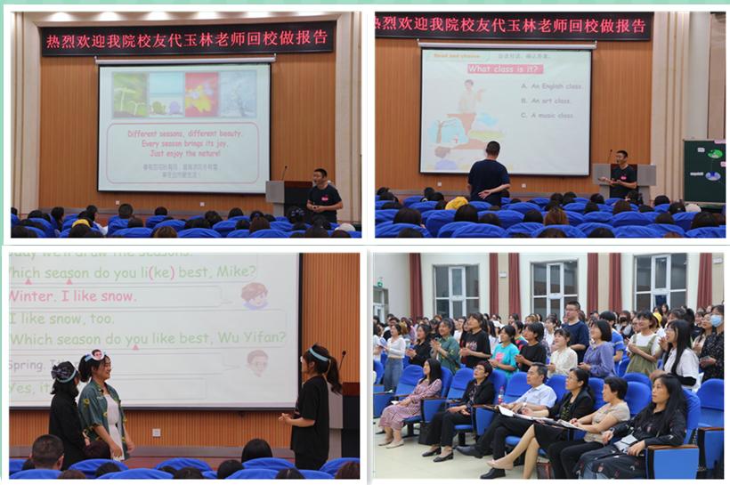 为顺应国家教育改革发展潮流,全面体现英语学科的育人价值,迎接师范专业认证,5月25日晚7:00-9:00,外国语学院成功举办“活力+”英语师范生从业技能培养工作坊第五期系列活动之---“名师进课堂”。该院英语师范生从业技能培养工作坊已连续成功举办四期,本次工作坊是第五期系列活动之---“名师进课堂”,邀请中小学一级教师代玉林老师为该院师范生作了题为“指向核心素养的小学英语教学”的报告。该院院长杨楠教授、英语师范生教师教育导师团和370多名英语师范生共同参加了此次活动。活动由该院副院长张颖主持。