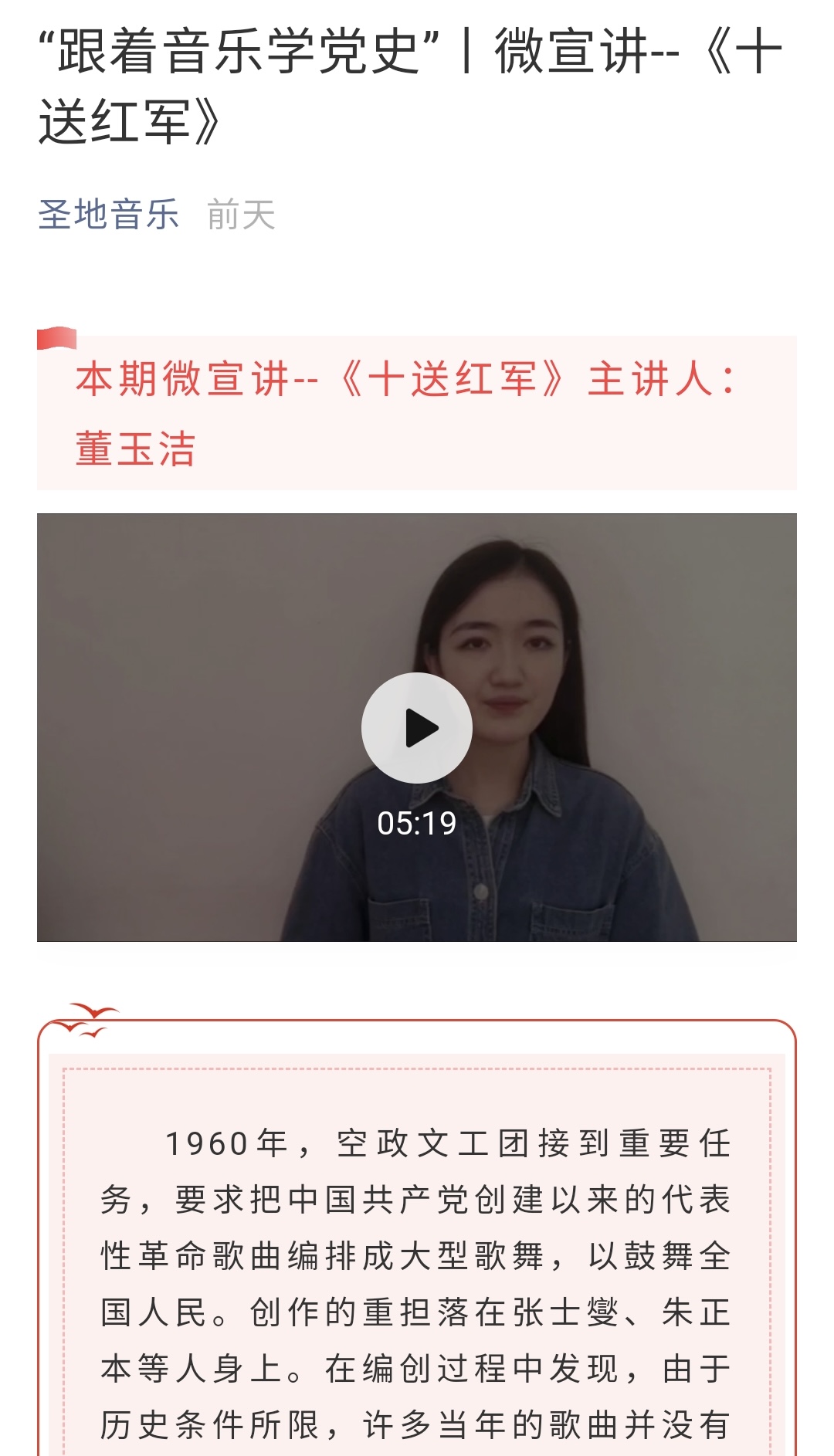 线上微宣讲。4月15日起,以党史一百年为主线,对红色歌曲的创作者、创作背景及蕴含的党史故事等进行介绍,定期推送在圣地音乐微信公众号、学院网站上。通过对音乐作品的整理,在视听交融间学习党史,形成了一条红色经典凝练成的红线,贯穿党史学习教育全过程,强化了红色基因价值引领。