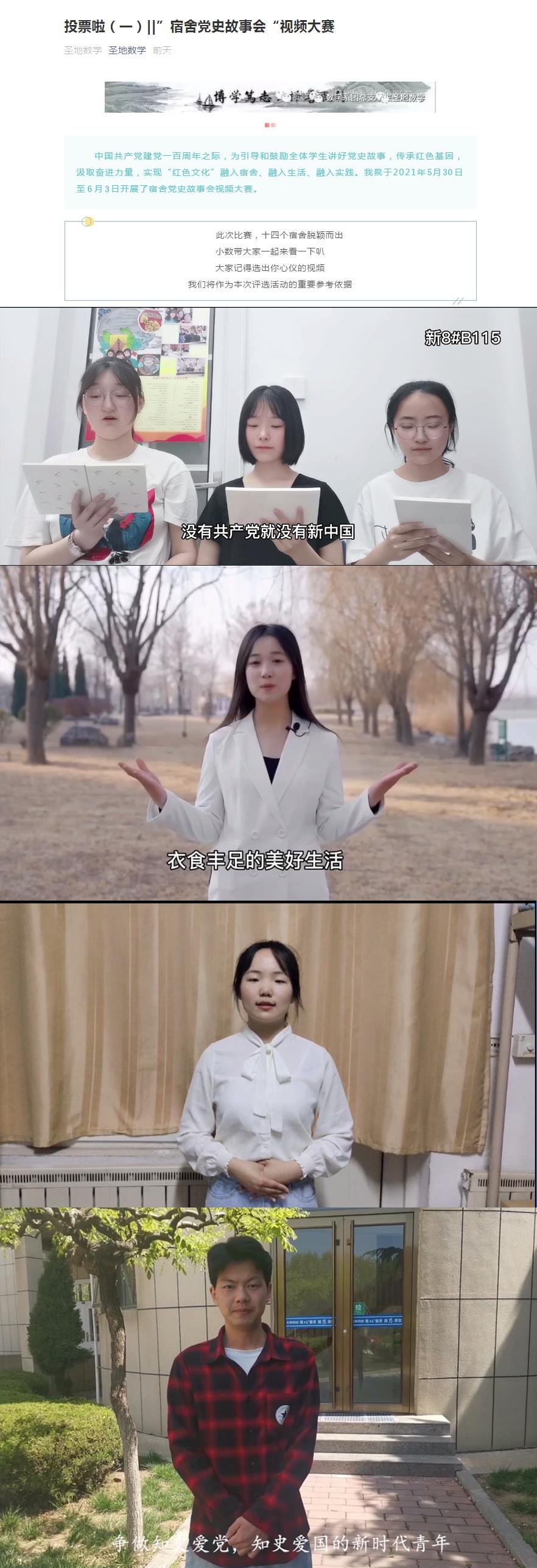 大赛以中国共产党各阶段重大事件、人物故事等为讲述主题,同学们通过镜头,声情并茂地在宿舍讲述陈云的“三不准”、吉鸿昌抗日就义、年龄最小的革命烈士“小萝卜头”等一个个故事,生动展现了中国共产党成立百年的光辉历程。本次比赛共征集短视频140个,经过层层筛选共有14个短视频入围公众号“圣地数学”推文投票环节,最终评选出一等奖三名、二等奖五名、三等奖六名。