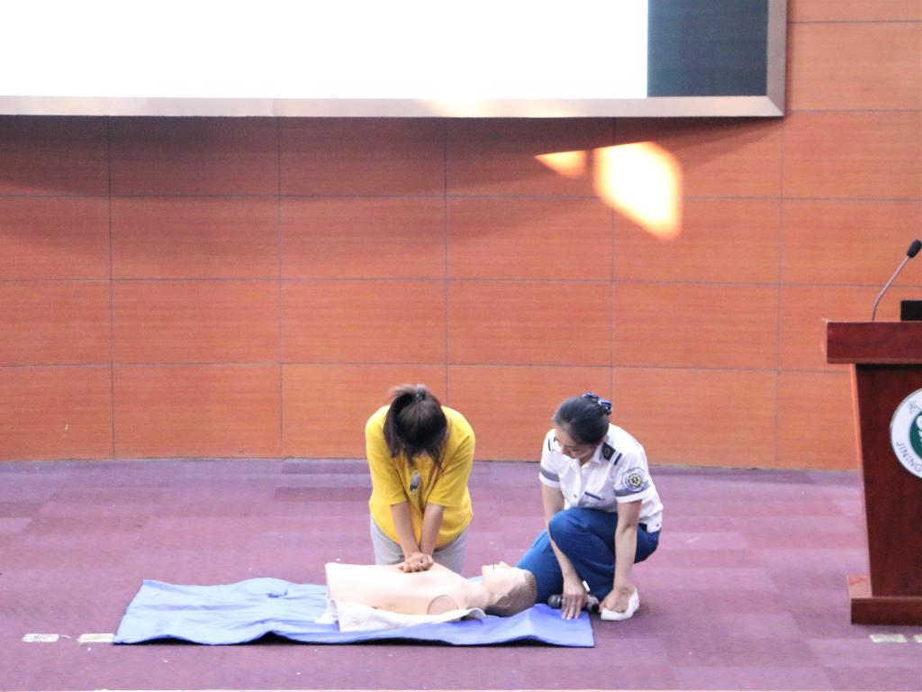 活动中,校团委书记马新蕾首先对贺磊和孔敏表示欢迎和感谢,并对即将出征的实践团队针对安全提出了要求。她指出,暑假期间天气炎热、气候多变、蚊虫较多,外出实践要把安全始终放在第一位。各团队指导老师要与同学们提前做好预案,及时关注实践天气,携带必要药品,乘坐正规车辆,在饮食起居各方面做好充分准备,确保团队师生安全。对分散实践的同学也要做好过程跟踪,及时掌握动态。随后贺磊主任从“如何拨打120”、“心肺复苏”、“外伤患者安全管理”和“常见急救处理”四个方面向实践队师生们进行了详细讲解。孔敏向大家演示了心肺复苏流程并耐心细致地指导现场同学进行实操。校团委社会实践部部长李尊向在场的师生介绍了2021年我校暑期社会实践活动的总体情况,针对意识形态安全、交通安全、食品安全等事项做了强调,要求各学院通过签订社会实践安全责任书,增强同学们安全责任意识。