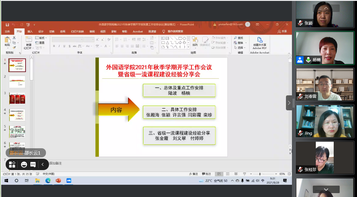 8月28日上午,外国语学院线上2021年秋季学期开学工作会议暨省级一流课程经验分享会顺利举行,该院全体教职工参加会议。会议由该院院长杨楠主持。