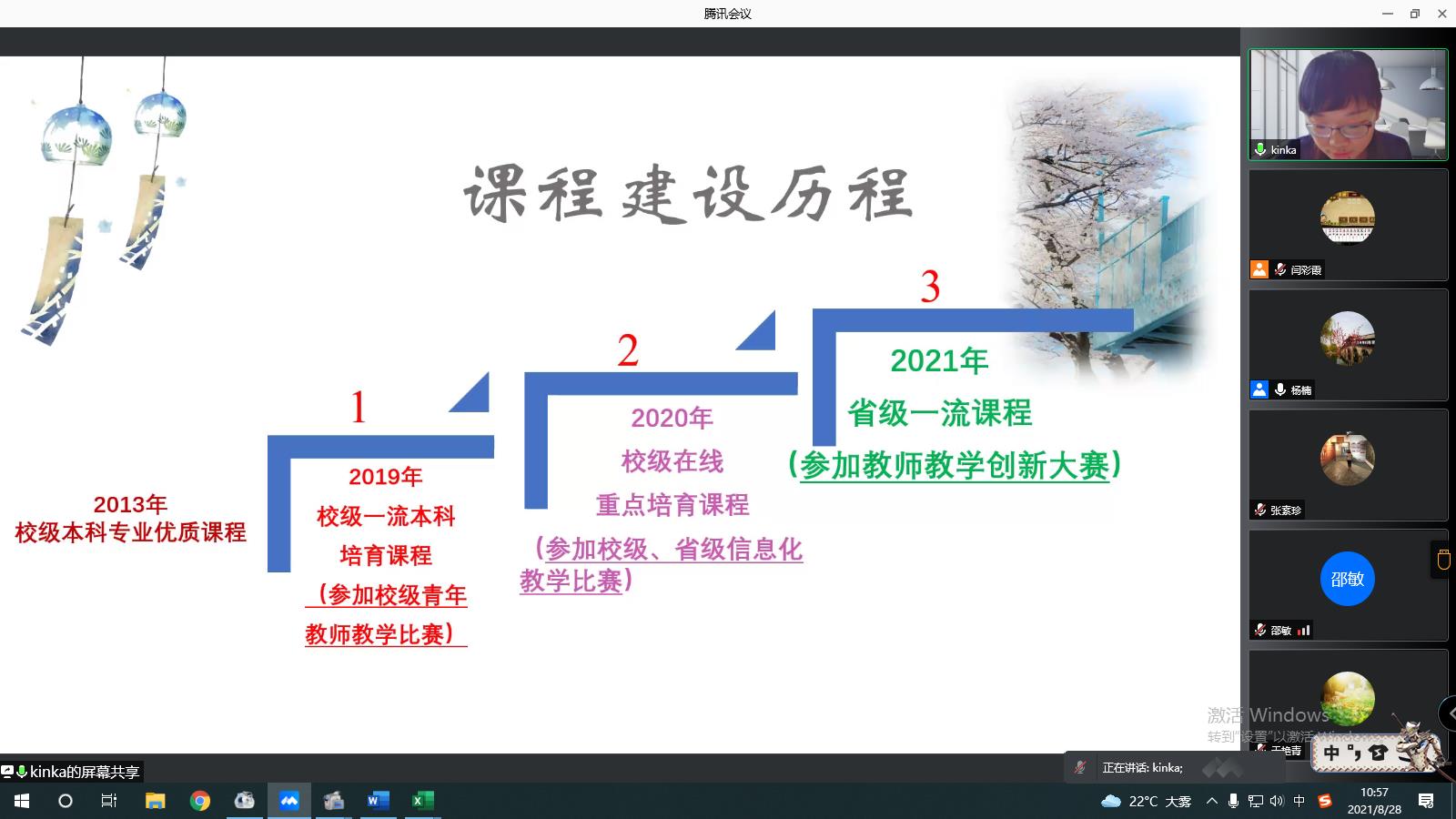 省级一流课程经验分享阶段,张金霞老师团队分享了建设省级一流课程的成功经验与心得。张金霞通过精心准备的PPT,从课程建设理念、课程教学设计展示、教学团队分工、线上线下课程考核评价方式、一流课程申报材料撰写细节、说课录课注意事项、课程创新特色、课程建设规划等方面作了全面详细的介绍,让全体老师深刻感受到了一流课程建设要功在平时,用心、用情上好每一节课,守初心,坚信心,有恒心,注重平时教学素材的积累,不断优化教学设计、凝练课程亮点、更新教学理念,就一定能让课程建设得越来越好,让更多学生受益。团队刘义翠老师、付婷婷老师从课程改革、教学评价、发展规划等方面做了补充介绍。老师们针对课程建设进行了热烈的线上讨论。
