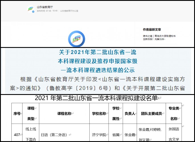 近日,山东省教育厅公布《关于2021年第二批山东省一流本科课程建设及推荐申报国家级一流本科课程遴选结果》。经学校推荐、形式审查、专家评审等综合各类型课程申报情况,省教育厅拟确定884门课程为第二批山东省一流本科课程。在团队成员付婷婷、刘义翠老师的共同努力下,外国语学院张金霞老师主讲的《日语(第二外语)》获批省级一流线上线下混合课程。