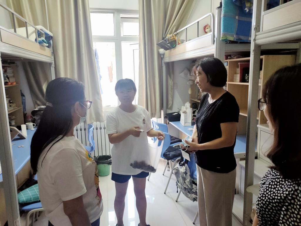 唐秋晶一行先后走访了女生宿舍和男生宿舍,与同学们亲切交谈,详细询问了大家的暑期学习生活经历、返校途中是否顺利、返校后学习生活中是否存在困难等,叮嘱同学们要严格遵守学校的防疫规定,减少聚集,避免扎推,每日进行健康打卡,宿舍及时通风;要尽快进入学习状态,认真完成网课学习;要充分利用校内场地,进行一定的体育锻炼,保持身体健康。在看望毕业年级学生时,详细了解了同学们的考研复习情况,鼓励同学们努力学习,为美好的明天而奋斗。老师们还对返校学生的宿舍用电安全、内务整理等进行了相应检查,对部分宿舍存在的安全卫生问题提出了整改意见。