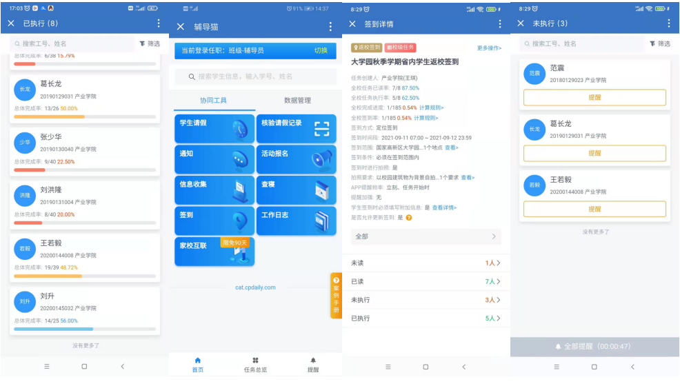 “出示绿码、测量体温,辅导猫到校签到,上传核酸检测报告”,同学们有序重返校园。此次产业学院学生返校充分利用了大数据,结合信息化手段来进行疫情防控。假期间学生利用辅导猫每天进行实时签到,既能掌控学生思想状况,也能实时了解学生行程动态。到校前,学生利用辅导猫上传健康行程码以及核酸检测报告,辅导员老师打开辅导猫便能随时查看每位学生相关情况,显著提高了学生工作的效率。
