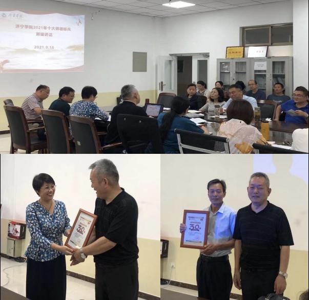 接着,2021年学校“十大师德标兵”郭瑞作了题为“再接再厉、奋勇争先,做一名优秀思政课教师”的发言。最后,分别为从事教育教学工作三十年的教师樊海涛、刘晗颁发“教师荣誉证书”。