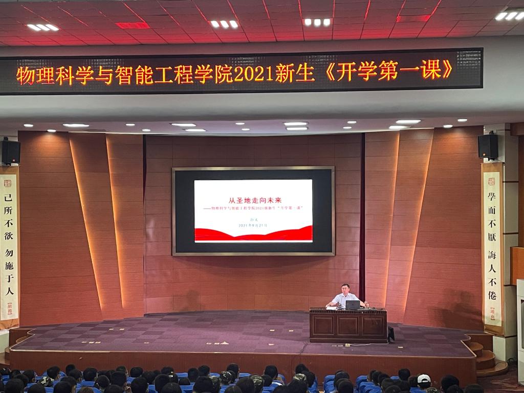9月21日晚,在9号楼报告厅物理科学与智能工程学院党委书记孙文以“从圣地走向未来”为题,为2021级全体新生讲授“开学第一课”。