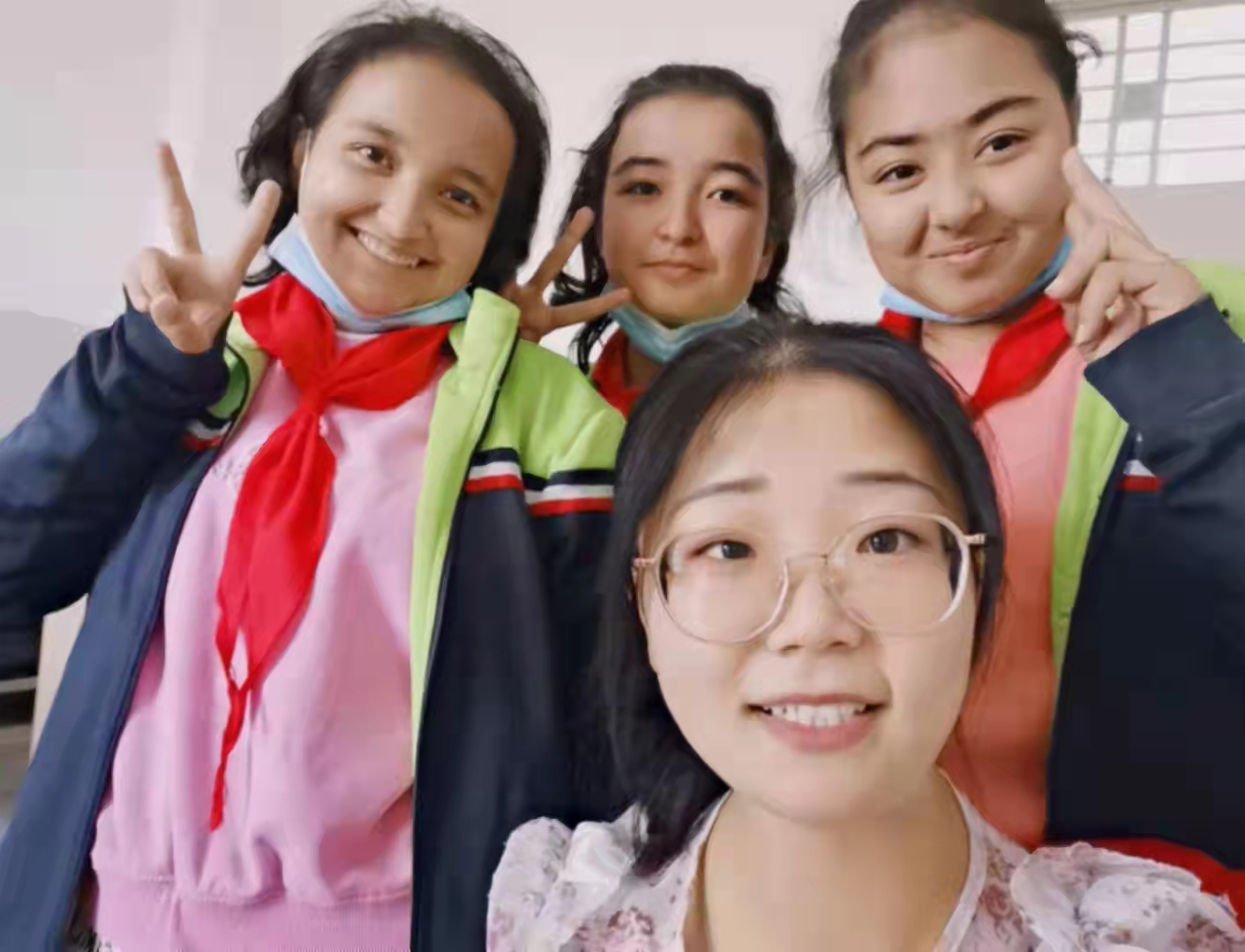 一节又一节,我慢慢地成为了学生口中的好老师。接连很多个学生来办公室找我,(下图是我和几个学生的合影,拍摄于2021年9月23日下午)我做到了!我收获了学生们的认可,和他们像朋友一样相处,把年轻热血撒在英吉沙四中这片土地上!可是旧的问题去新的问题来,几堂课后,她们对我这个新老师的新鲜感不减反增,课堂上太活跃了!不夸张地讲,几乎全班都高举小手回答问题,这是令我出乎意料的,我的选择困难症犯了,孩子们正值年少,愿意表现自己渴望得到关注,我选择任何一个学生来回答都是在打压其他人的上课热情。毕竟课堂只有短短的四十分钟,我又该如何处理新的问题呢?