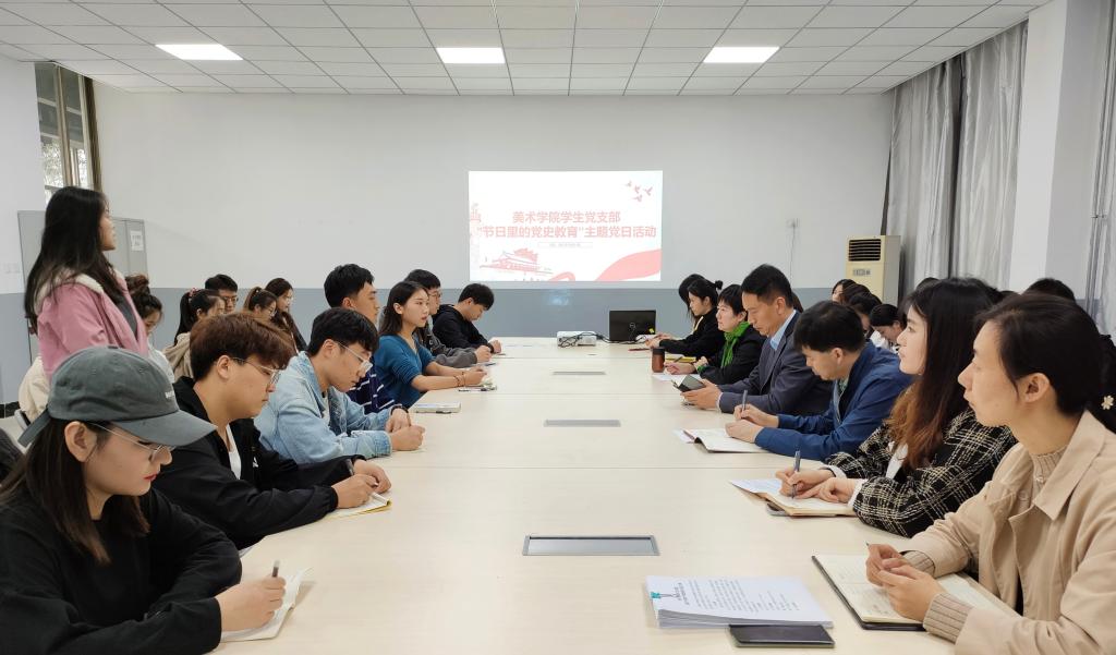 10月14日,美术学院学生党支部于6号楼B107开展“节日里的党史教育”主题党日活动。校党委统战部部长张永强、组织部副部长王振平对活动开展情况进行督导。美术学院党委书记杨晓青、党委副书记孔翠出席活动。