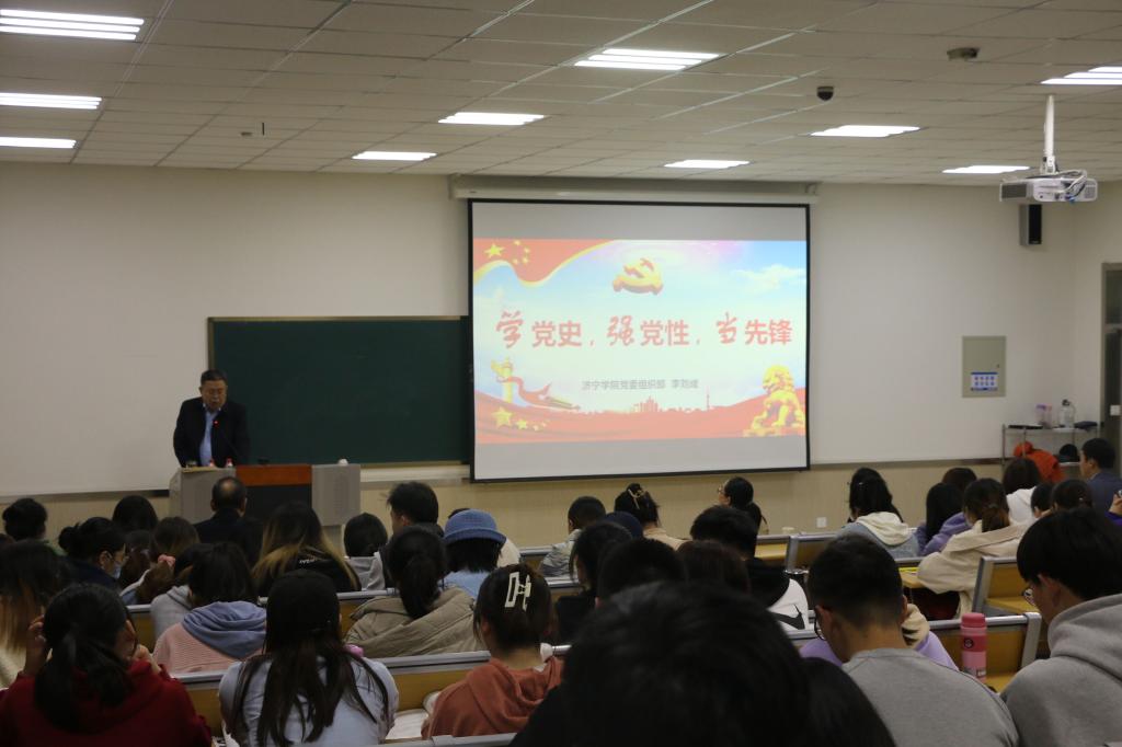 开班仪式后,学校正处级组织员李刘成同志受邀以《学党史 强党性 当先锋》为主题做专题报告,从为什么要学党史、重点要学什么、如何学好党史三个方面展开讲解,重点阐述了红船精神、长征精神、抗疫精神、延安精神、抗美援朝精神和科学家精神。旁征博引、深入浅出的讲解,带领同学们从中国共产党伟大精神谱系中体悟共产党人的初心和使命,号召同学们铭记党的丰功伟绩,继承优良革命传统,用实际行动来践行跟党走的理想追求。