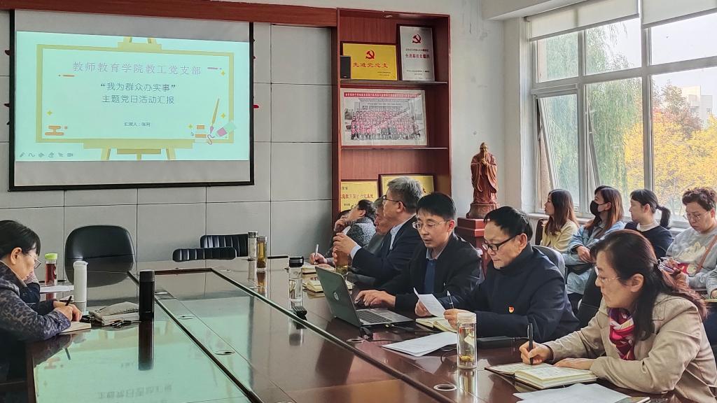 10月27日下午,教师教育学院教工党支部在会议室召开“我为群众办实事”主题党日活动,围绕主题总结交流经验,安排接续工作。会议由教工党支部书记刘树真主持,全体教工党员参加。