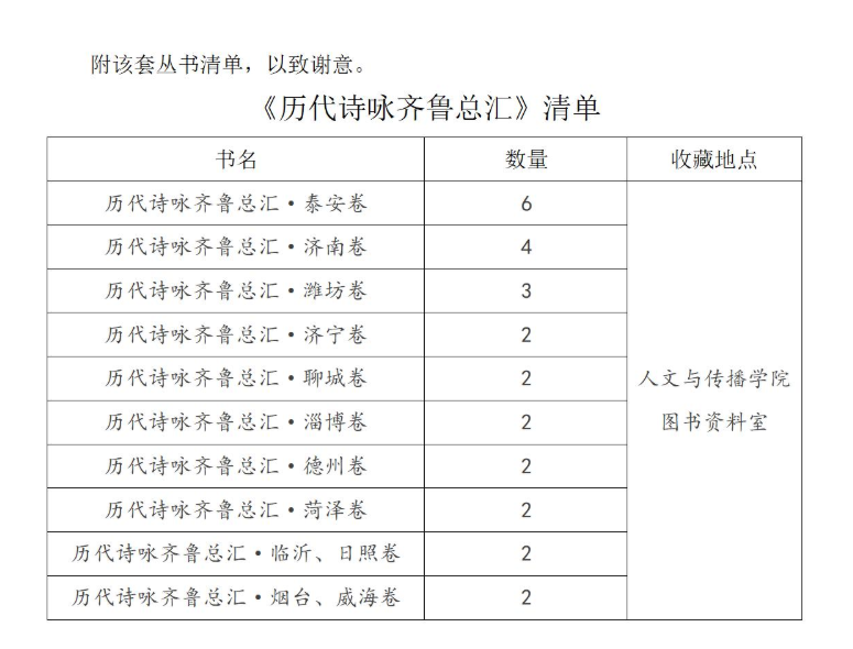 近日,大型文化丛书《历代诗咏齐鲁总汇·济宁卷》主编王振星教授代表丛书编委会向人文与传播学院赠送完整图书一套。