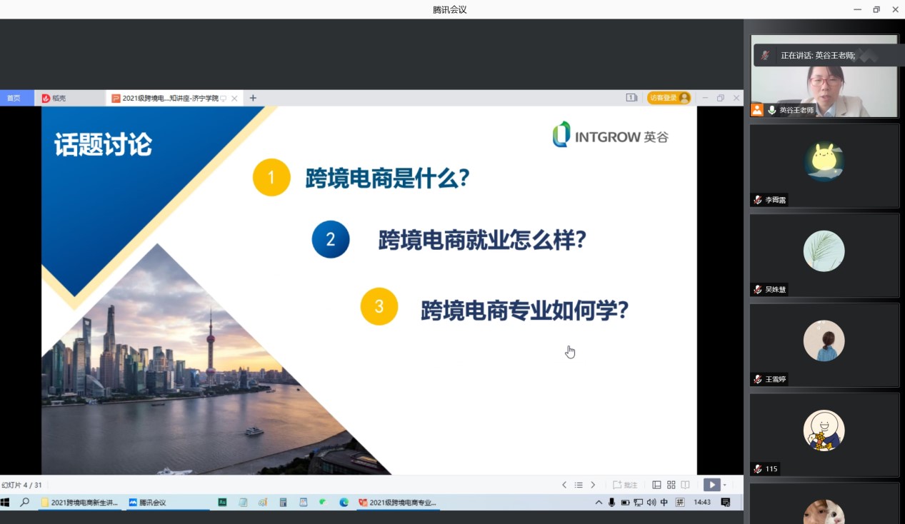 为使2021级商务英语专业新生对自己的专业有更好的了解,做好学习规划,10月29日下午,外国语学院联合校企合作单位青岛英谷教育科技股份有限公司通过腾讯会议举办了商务英语(跨境电子商务方向)专业认知讲座。讲座由青岛英谷教育科技股份有限公司的跨境电商讲师、项目经理王树叶主讲。外国语学院商务英语教研室主任李霄露、商务英语专业任课教师、2021级商务英语专业学生参加了线上讲座。