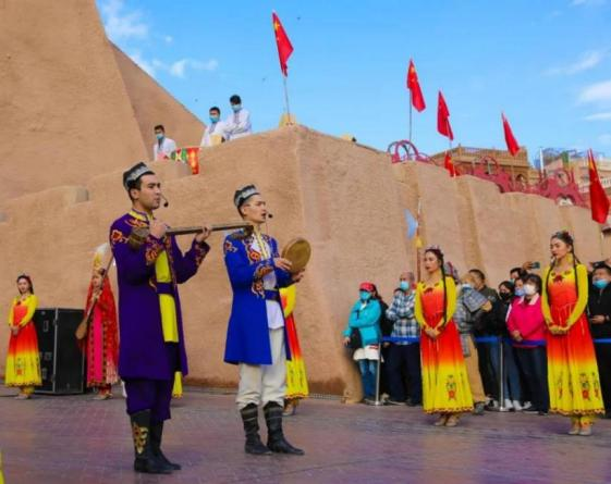 每天10点的古城开城仪式前,来自天南海北的游客和网红爷爷司马仪、萨吾提,欢快地跳着麦西来甫,准时来到东门,游客纷纷举起相机、手机,定格一张张美好的画面。