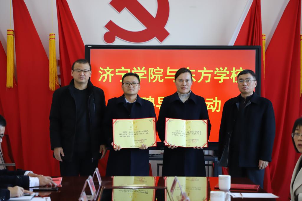 在曲阜东方学校会议室,孙文及该院副院长张营分别为东方学校中学教师张衍峰、付洪颁发了物理学(师范)专业兼职教师聘书,曲阜东方学校校长王廷志为该院教师刘文、韩立颁发了中学兼职教师聘书。