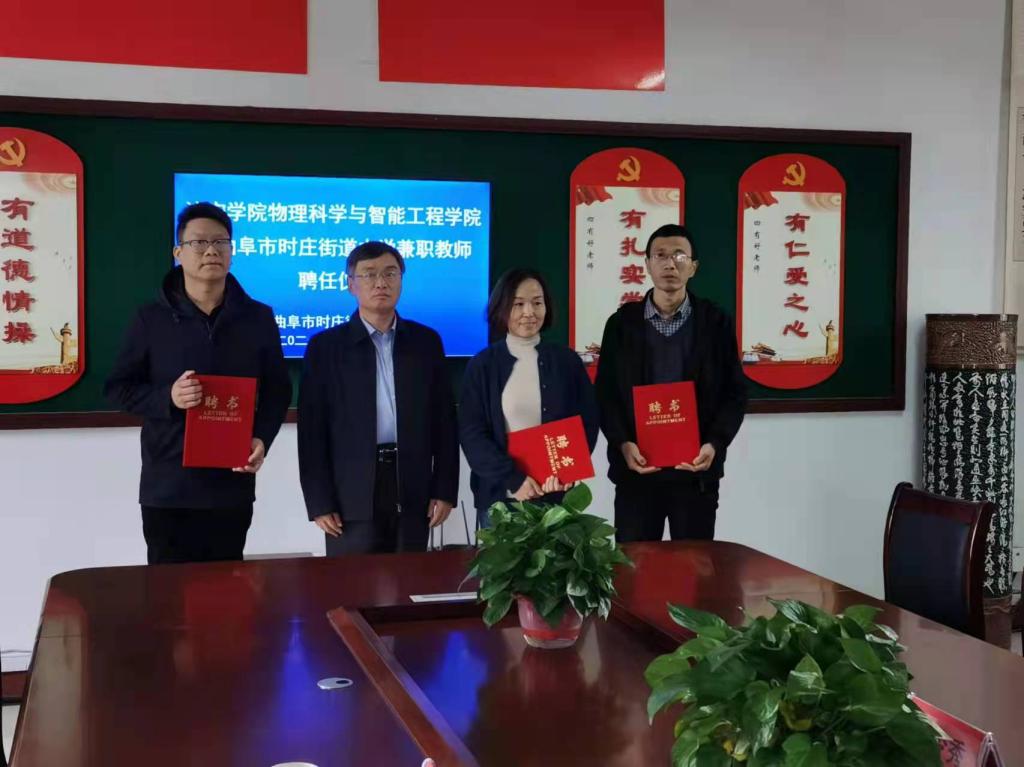 在曲阜市时庄街道中学会议室,该院党委书记孙文为时庄街道中学教师孔令秀、孔军、孔宪玉、张强颁发了物理学(师范)专业兼职教师聘书,时庄街道中学校长朱明新为该院教师岳现房、李树清、齐崇海颁发了中学兼职教师聘书。