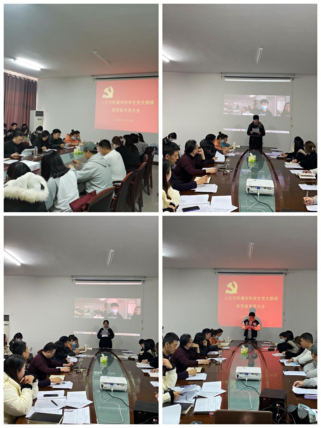11月15日下午,人文与传播学院学生党支部在会议室召开预备党员接收大会,会议以线上线下两种形式同时进行。该院学生党支部22名正式党员,49名发展对象参加会议,该院党委书记卫建勋、党委委员李芬到会指导,会议由学生党支部书记马永涛主持。